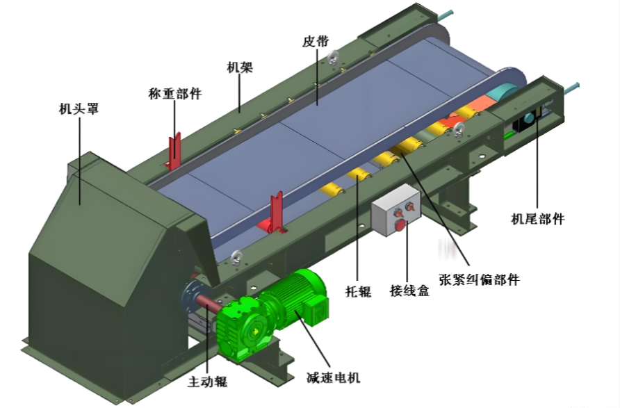 飼料生產線皮帶輸送機由輸送帶、驅動裝置、滾筒、托輥、張緊裝置和機架等部件組成。皮帶可以選擇橡膠、PVC或聚氨酯材質。也可增加防護罩配件,起到防塵、防濺的作用。電機驅動滾筒旋轉,滾筒通過摩擦力帶動輸送帶移動,從而將放在皮帶上的飼料從起點輸送到終點。